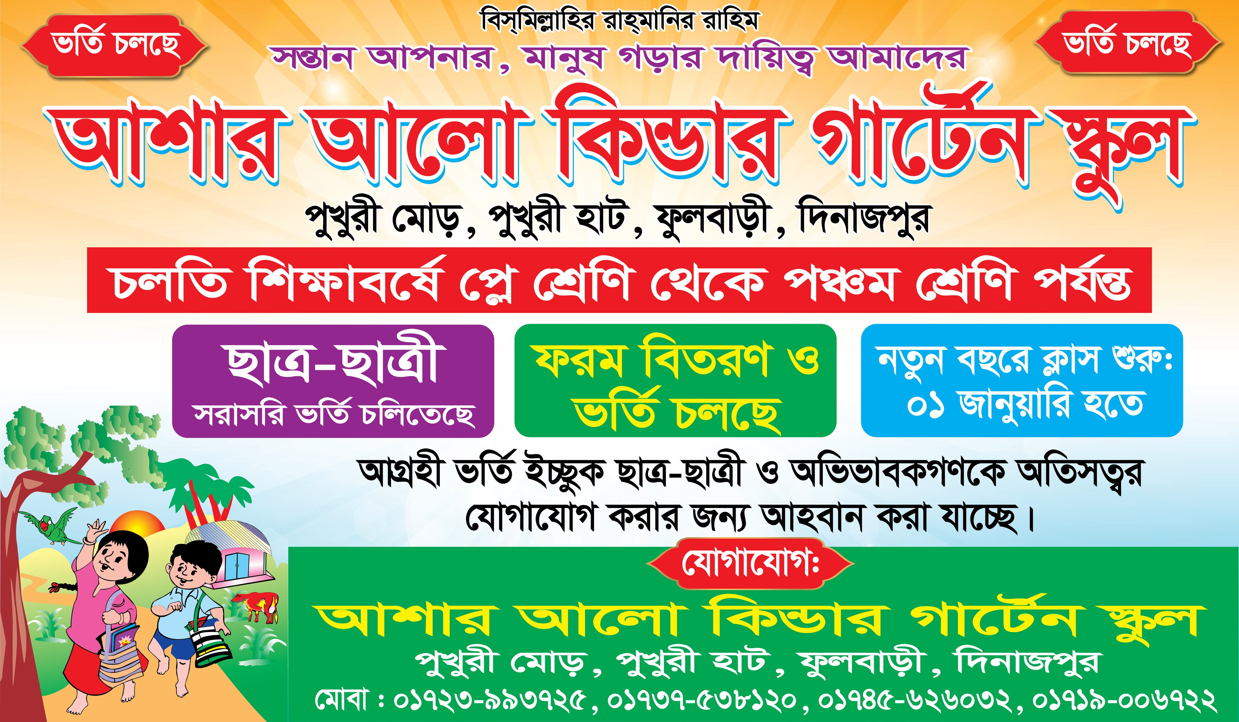 আশার আলো কিন্ডারগার্টেন স্কুলে ২০২৬ সালের শিক্ষাবর্ষে প্লে থেকে পঞ্চম শ্রেনী পর্যন্ত ছাত্র/ছাত্রী ভর্তি চলছে।